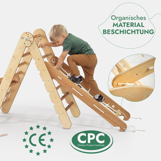 4in1 Montessori Klettergerüst Set: Kletterdreieck mit Rutsche, Kletterbogen, Kletternetz, für Kinder 1-7 Jahre – Beige