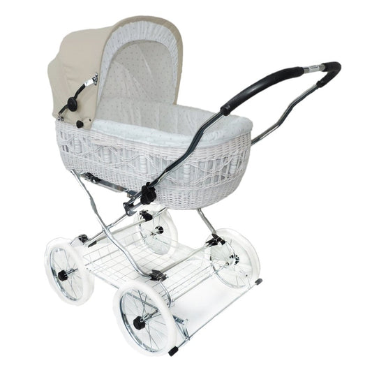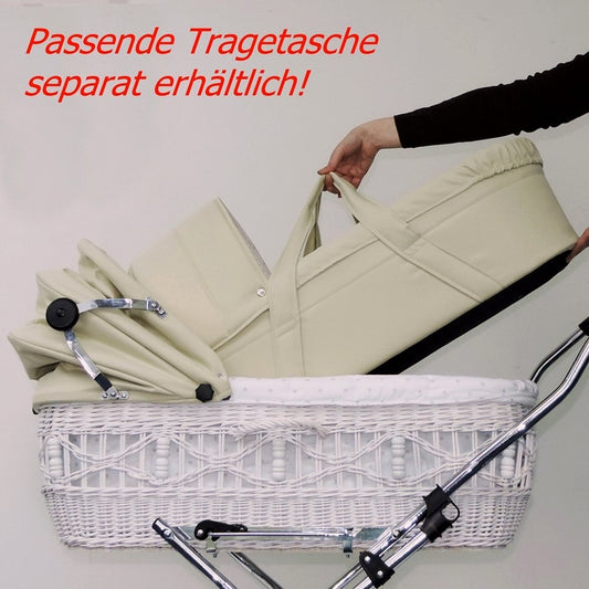 EICHHORN Weidenkorb Kinderwagen, Korb Weiß, Stoff Beige - große Liegefläche, weich gefedert, inklusive Matratze und Regenschutzbezug