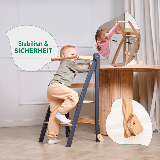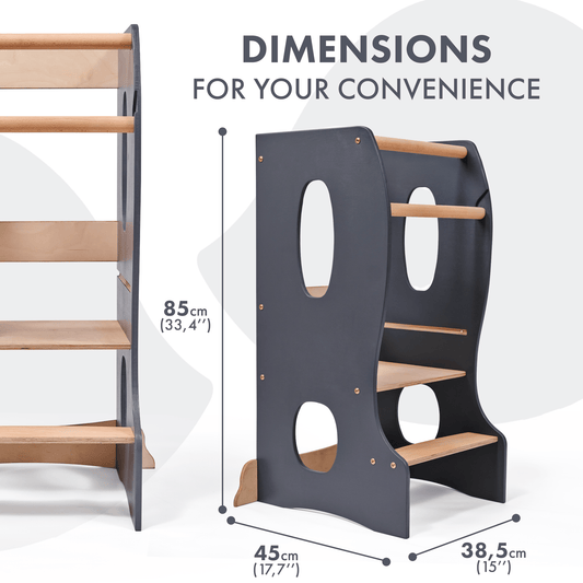 Stabiler Montessori Lernturm: Mitwachsender Kinderstuhl aus Holz – Grau