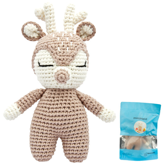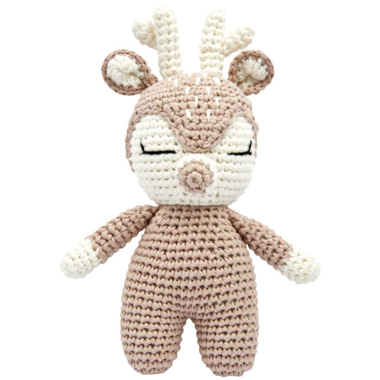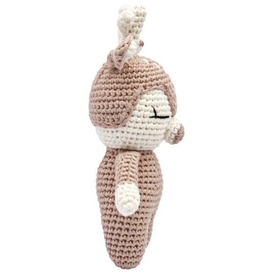 Handgestrickter Reh Ivy Set Babyrassel Holzspielzeug und Baumwolle