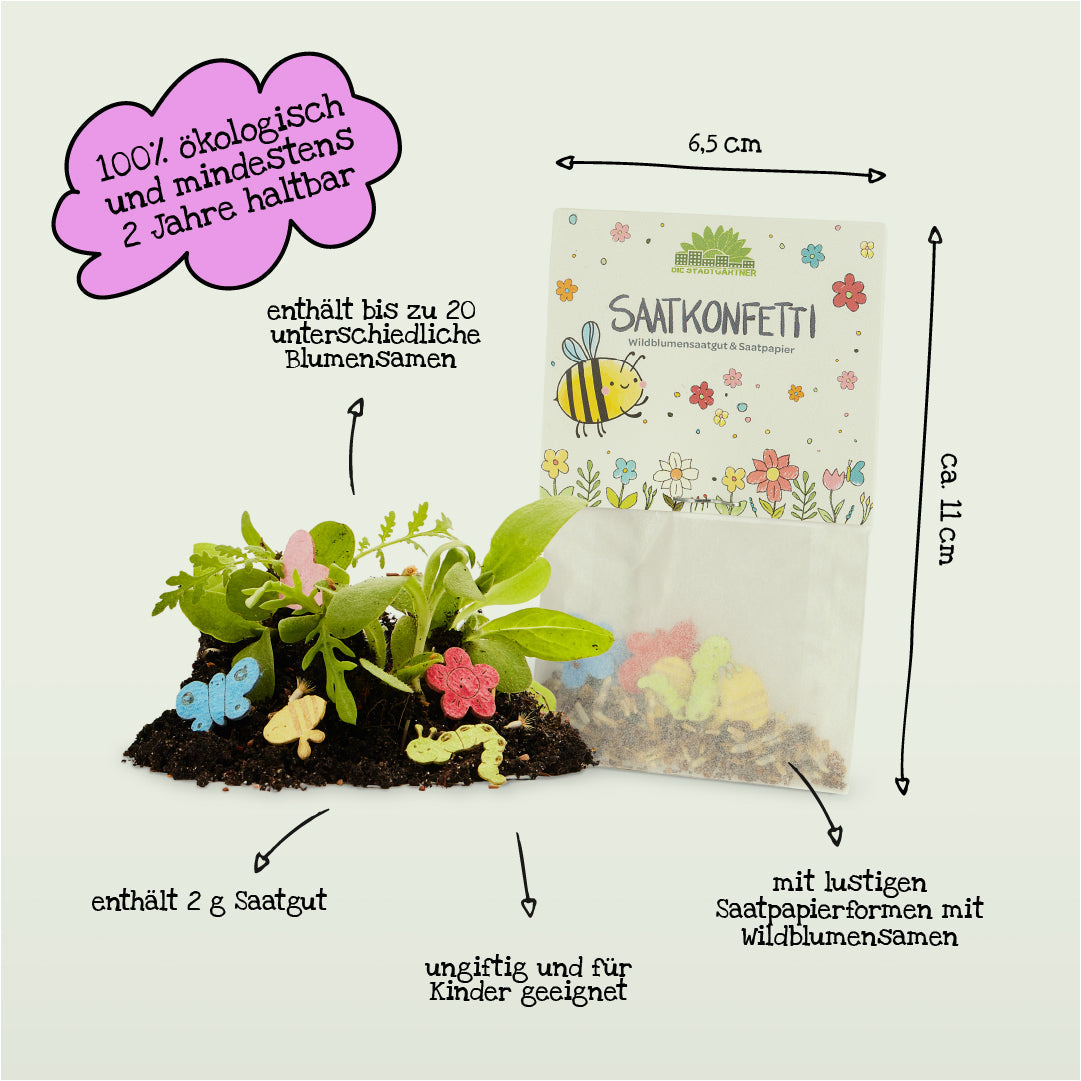 đ MITGEBSEL: EnthĂ€lt 10 liebevoll gestaltete TĂŒtchen mit einer bunten Mischung aus 2 Gramm ungiftigem Saatgut und 5 lustigen Saatpapierformen. Das Konfetti bringt Kinderaugen schon bei der Aussaat zum Leuchten.