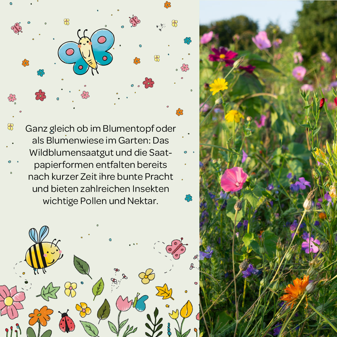 đ MEHR BLUMEN: Mit dem Samenkonfetti tust du etwas Gutes fĂŒr unsere Umwelt und machst viele Bienen glĂŒcklich. Entdeckt gemeinsam die Natur, verstreut das bunte Saatkonfetti und schaut den Wildblumen beim Wachsen zu.