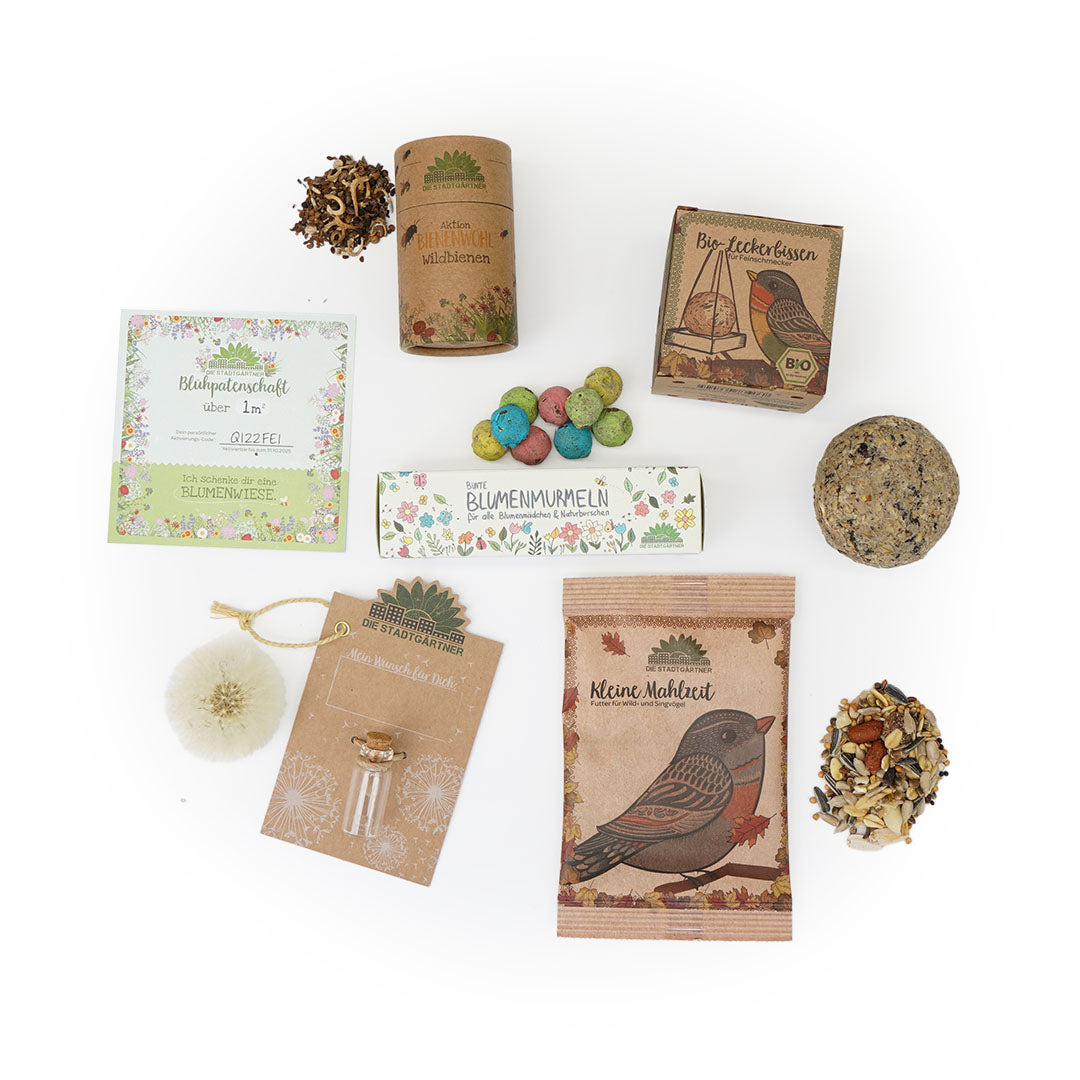 - Enthält 6 Geschenke für den Adventskalender: Bunte Blumenmurmeln, Kleine Mahlzeit für Vögel, Kleiner Wunscherfüller, Leckerbissen Bio, 1 qm Blühpatenschaft, Dose Bienenwohl-Saatgut"