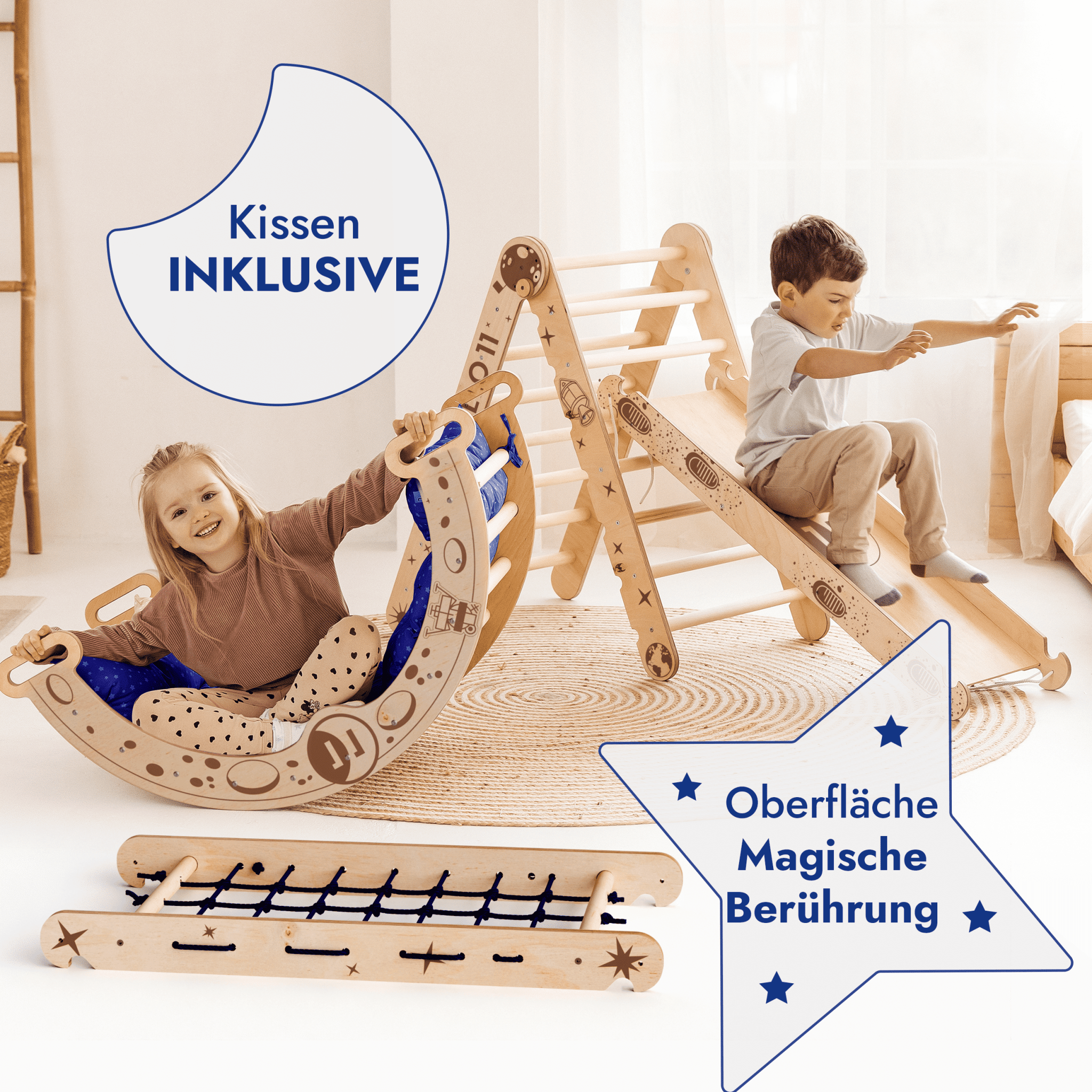 Das Apollo 5-in-1 Kletterset ist der persönliche Weltraumbahnhof Ihres Kindes, wo jede Bewegung eine Mission, jedes Spiel eine Entdeckung und jedes Lachen ein Signal von der Sternenstation ist. Mit Sorgfalt, Inspiration und Glauben an große kleine Träume geschaffen.