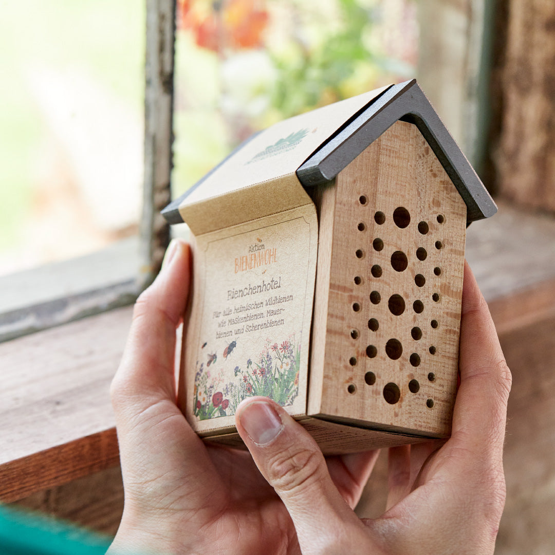 Das Bienchenhotel bietet mit den unterschiedlich großen Bohrungen einen sicheren Unterschlupf für zahlreiche Wildbienen wie Maskenbienen, Mauerbienen und Scherenbienen. Unser Insektenhotel leistet so einen Beitrag zur Erhaltung der Artenvielfalt.