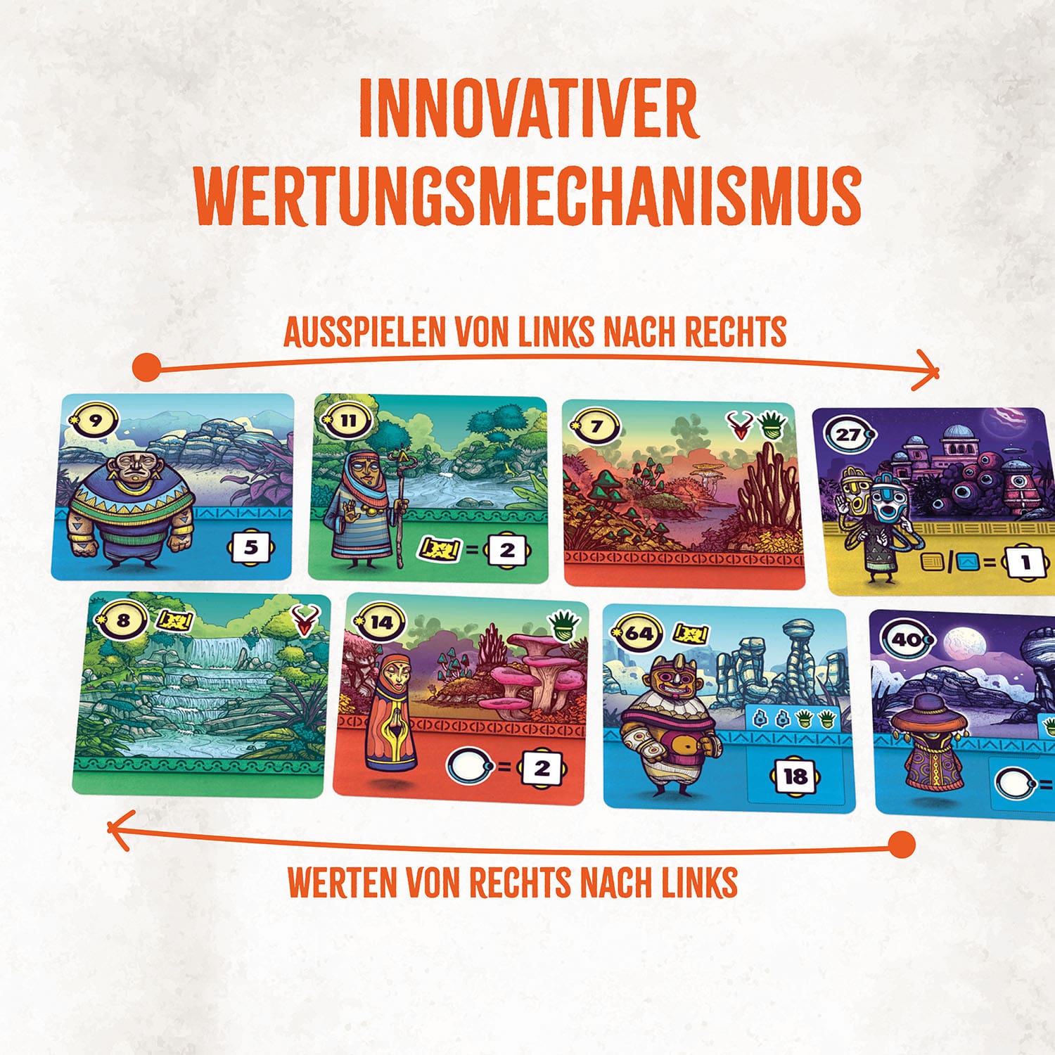 Entdeckt die Geheimnisse jenseits des Nebelmeers! In Faraway erkunden bis zu sechs Spielerinnen und Spieler ab zehn Jahren den sich ständig verändernden Kontinent Alua. Das Besondere: Die Karten werden in acht Runden von links nach rechts ausgelegt, während die Bewohner spannende Aufgaben stellen, die am Ende Ruhmespunkte einbringen. Das Besondere: Die Wertung erfolgt in umgekehrter Reihenfolge – von rechts nach links! Nur eine geschickte Strategie auf der Reise durch Alua wird zum Sieg verhelfen. Origineller und schneller Spielspaß zu zweit oder in der Gruppe.