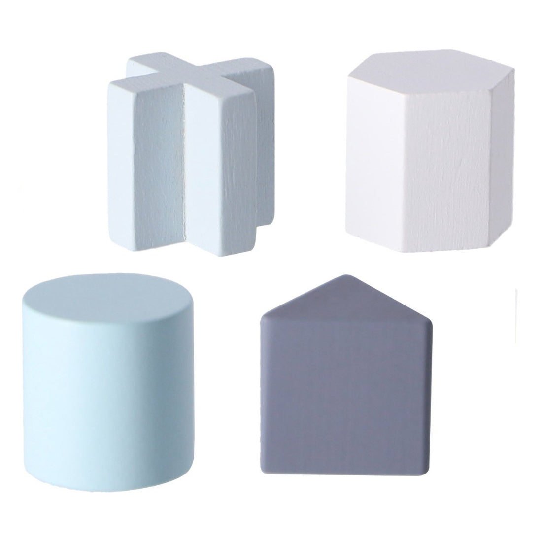Dieses Set enthält vier Holzformen - ein Kreuz, einen Kreis, ein Quadrat und ein Dreieck - jeweils in verschiedenen Farben.