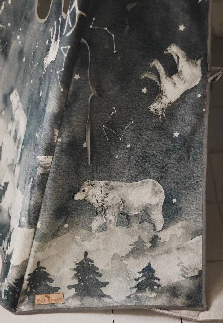 Wenn draußen der Schnee fällt und drinnen die Fantasie blüht, wird dieses Tipi zum gemütlichen Rückzugsort. Das von Winterabenden inspirierte Design mit Sternen-Tiermuster, illustriert von Kasia Goraj-Stróżyńska, bringt Magie ins Kinderzimmer – und lädt zum Spielen, Lesen und Träumen ein.