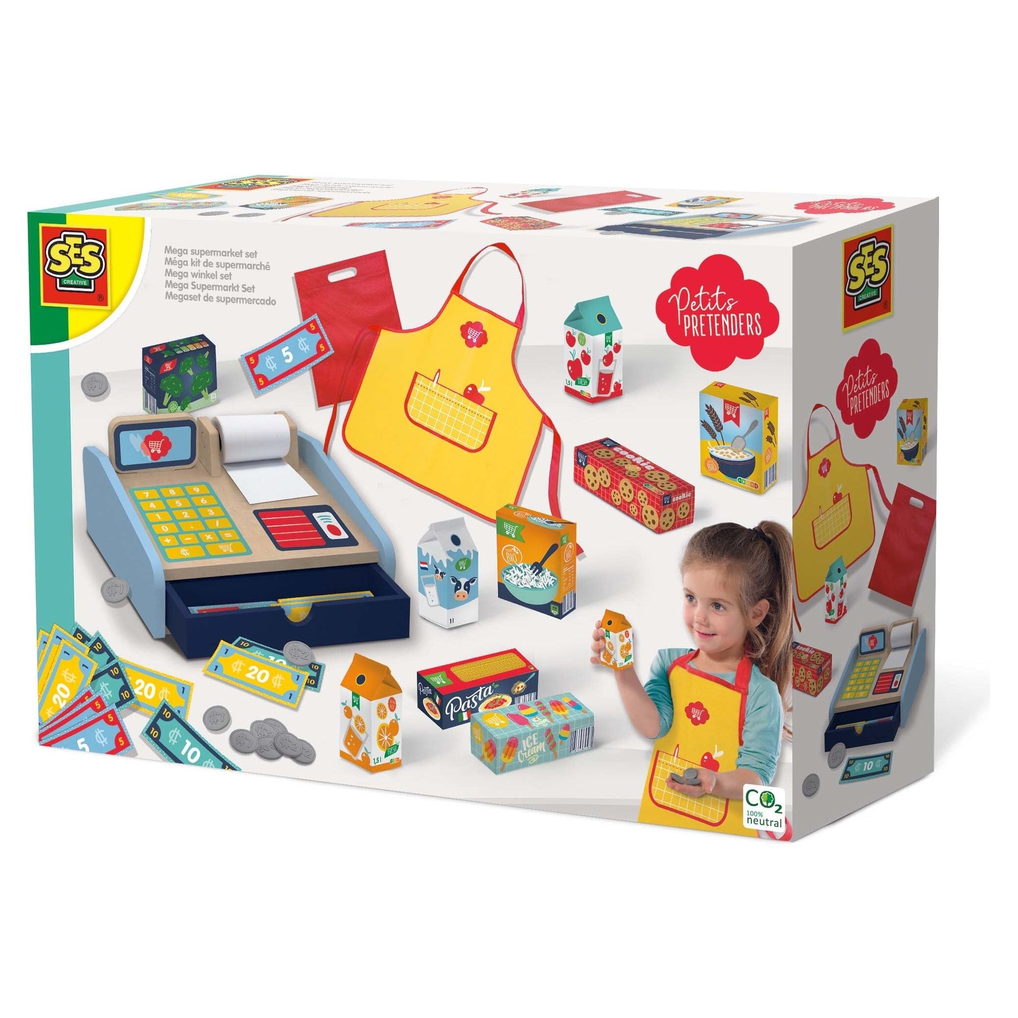 - Inhalt: Holz-Registrierkasse, Spielgeld, Belege, Einkaufstasche, Produkte, Schürze u.v.m.
