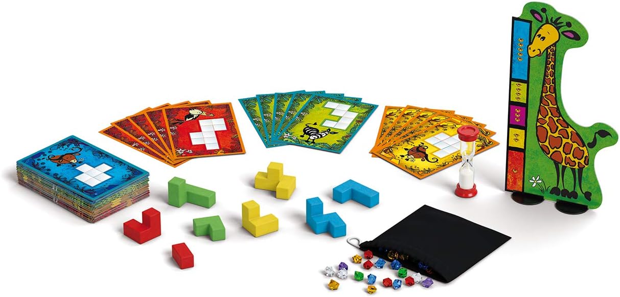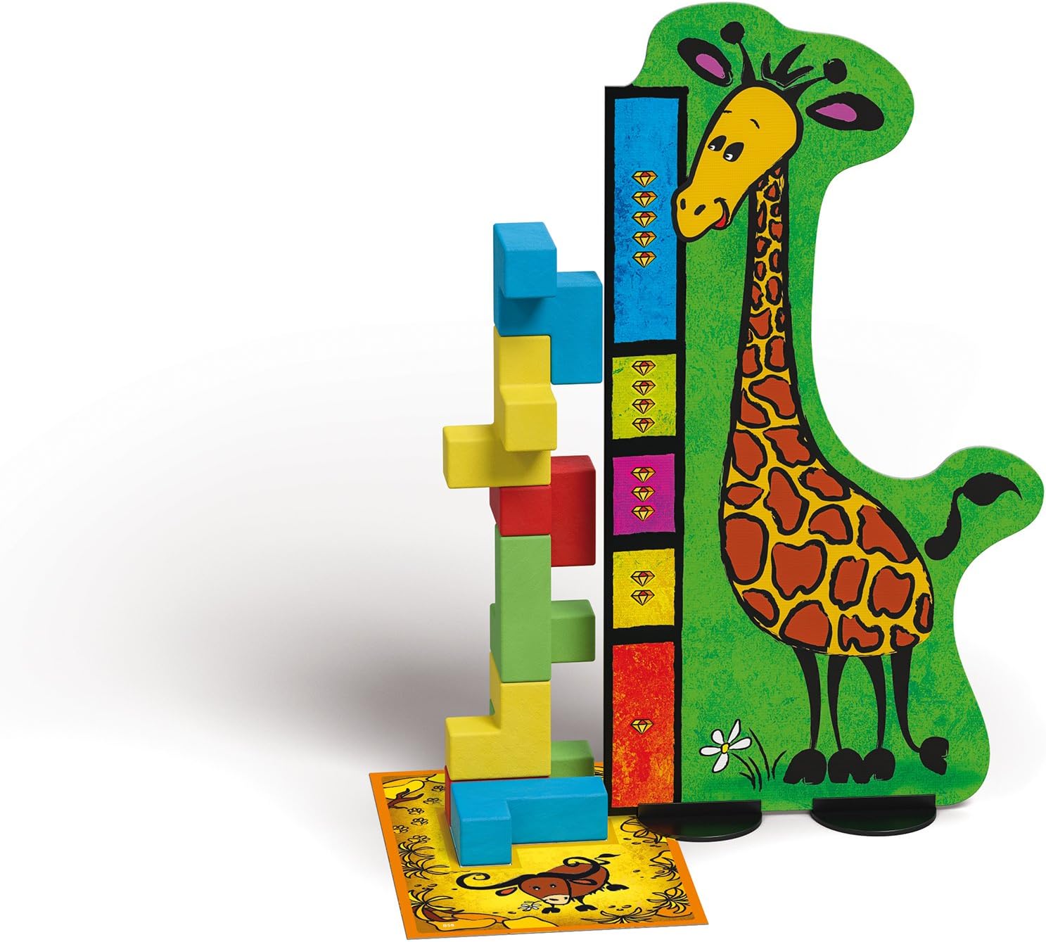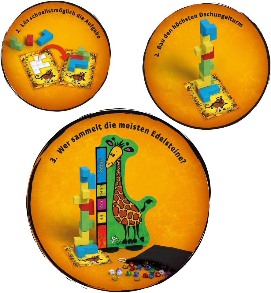 Gleichzeitig und so schnell wie möglich legen die Kinder ihre Bausteine auf die Grundfläche. Dabei darf kein Kästchen frei bleiben oder überbaut werden. Dann geht der Wettlauf um den höchsten Turm weiter. Dafür haben die Spieler 90 Sekunden Zeit. Danach kontrollieren alle, ob die Flächen richtig belegt sind und messen mit der Giraffe die Höhe der Türme. Je höher, desto mehr Edelsteine gibt es. Es gewinnt, wer nach sechs Runden die meisten Edelsteine besitzt.