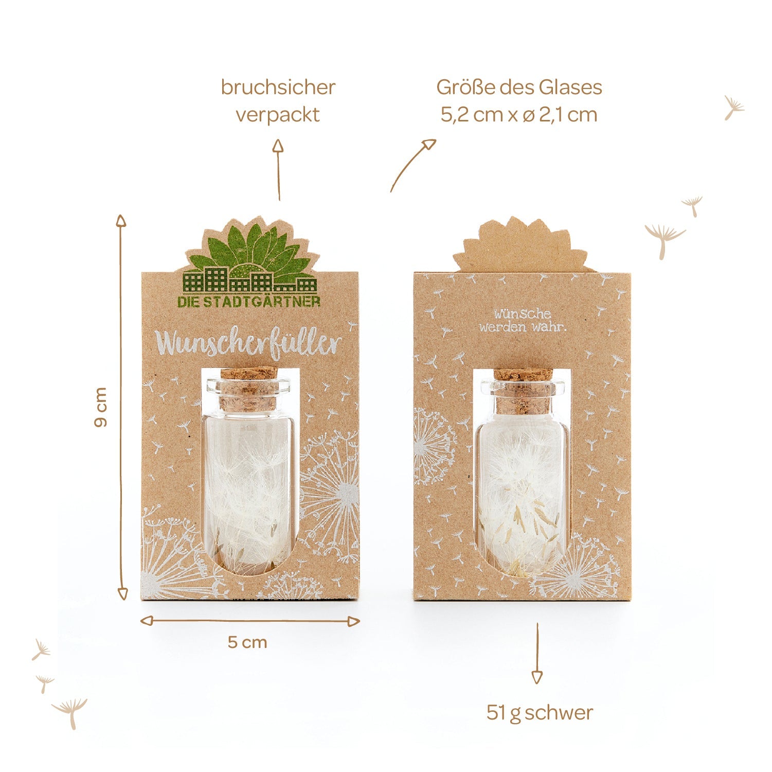 Der Wunscherfüller ist das perfekte Geschenk für jeden Anlass, zu dem du einem lieben Menschen deine guten Wünsche überbringen möchtest. Zum Geburtstag, zur Hochzeit, zu Weihnachten, zum Valentinstag oder auch einfach mal so als kleine Aufmerksamkeit zwischendurch. Der Wunscherfüller ist mit vielen kleinen, flauschigen Pusteblumenschirmchen gefüllt. Mit den handgepflückten Pusteblumenschirmchen im Glas triffst du genau ins Herz. Erinnerungen an die Sorglosigkeit der Kindheit werden wachgerufen und der Glaube an Zauberei wieder zum Leben erweckt. Und nicht nur das: Wer ganz fest daran glaubt, wird feststellen, dass Wünsche eben doch oft wahr werden!